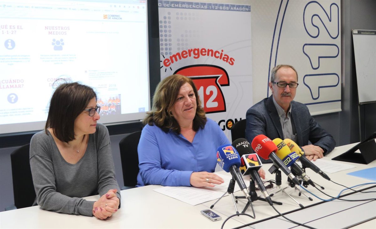La directora general del Justicia e Interior del Departamento de Presidencia, María Ángeles Júlvez; el jefe del Servicio de Seguridad y Protección Civil, Miguel Ángel Clavero, y la concejala de Seguridad Ciudadana y Movilidad del Ayuntamiento de Huesca, Teresa Sas, han presentado este jueves, en una rueda de prensa en Zaragoza, el balance anual del Centro de Emergencias y las actividades del Día del 112, que se conmemora este domingo, 11 de febrero.