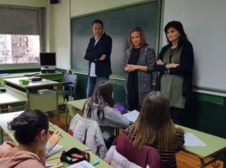 La consejera de Educación, Cultura y Deporte del Gobierno aragonés, Mayte Pérez, ha visitado este martes una clase de inglés en el IES Pedro de Luna de Zaragoza, uno de los centros donde se realizan las pruebas. Le han acompañado el director general de Innovación, Equidad y Participación, Toni Martínez, y la directora del centro, Sofía Pardo.