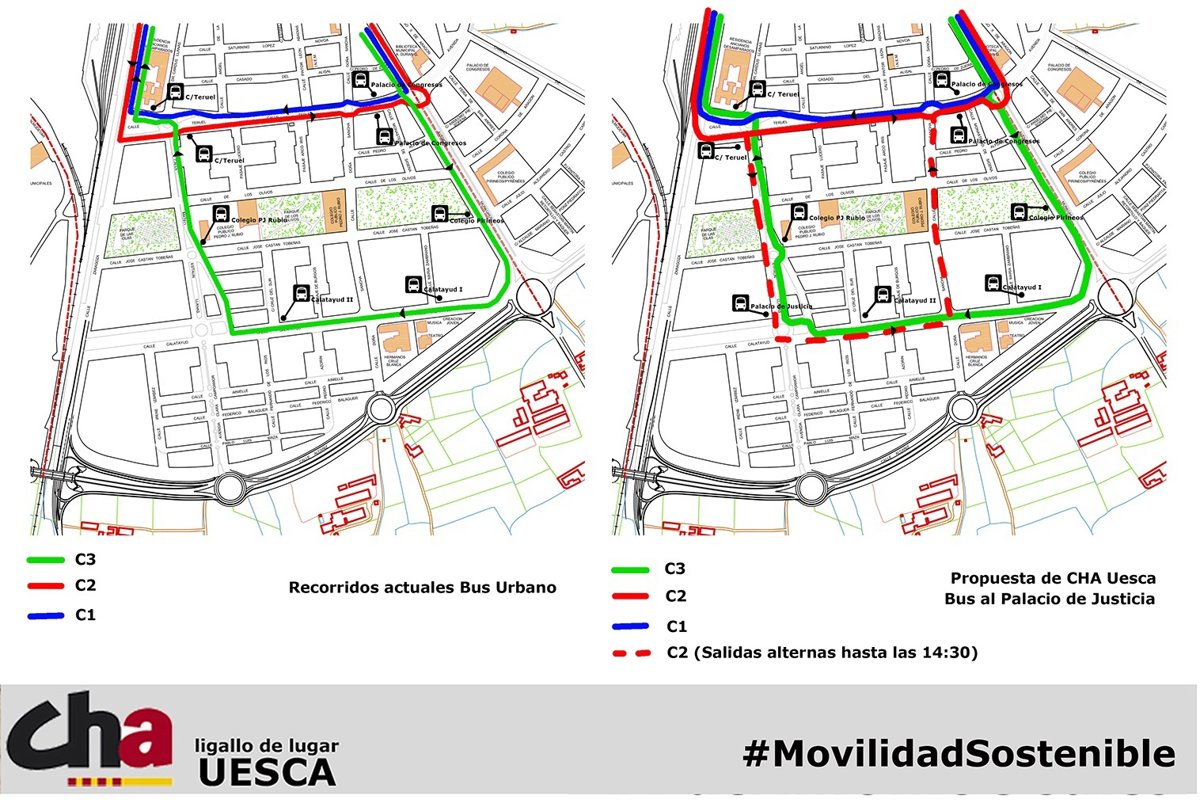En concreto, en la Ponencia de Movilidad de esta semana, el portavoz de CHA en el Ayuntamiento oscense, Francho Nagore, ha pedido que se modifique la linea C-2 del autobús urbano de forma que se pueda dar servicio hasta el nuevo Palacio de Justicia.