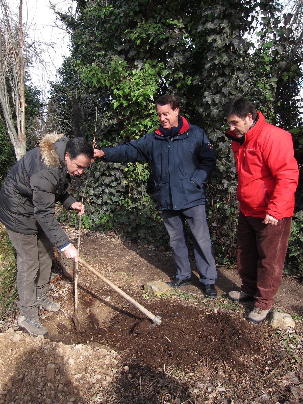 El presidente de la CHE, Xavier de Pedro, y el consejero municipal de Medio Ambiente del Ayuntamiento de Zaragoza, Jerónimo Blasco, acompañados por el alcalde pedáneo de Garrapinillos, Luis Miguel Roda, han plantado dos chopos en este humedal y han descubierto una placa conmemorativa de su 20 aniversario en el mirador de la balsa.