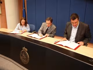 El presidente de la Confederación Hidrográfica del Ebro (CHE), organismo autónomo, adscrito al Ministerio de Agricultura, Alimentación y Medio Ambiente (MAGRAMA), Xavier de Pedro; el alcalde de Panticosa, Ricardo Laguna; y la alcaldesa de Hoz de Jaca, Esperanza López, han firmando hoy en la sede del Organismo, en Zaragoza, el convenio para la compraventa de una parte de la energía generada en la central hidroeléctrica de El Pueyo de Jaca (Huesca).