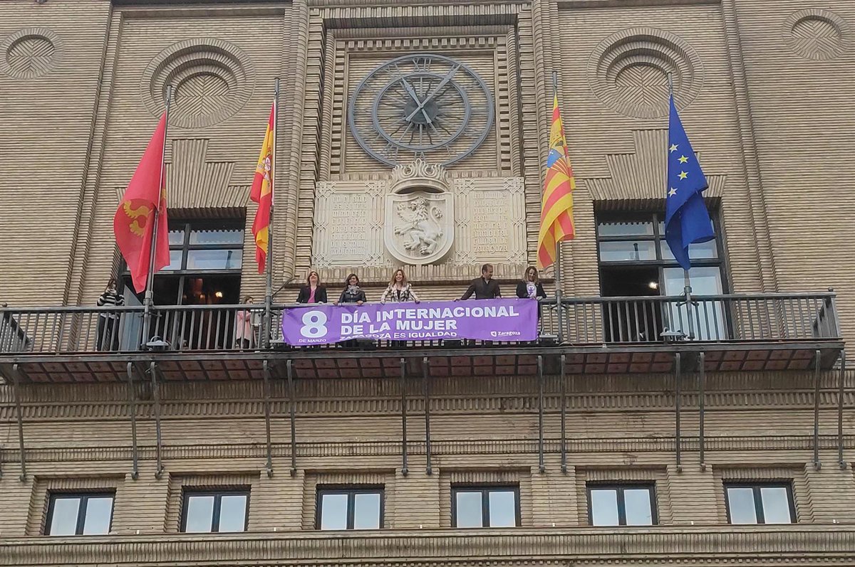 La alcaldesa de Zaragoza, Natalia Chueca, coloca la pancarta del 8M en la Casa Consistorial junto a los portavoces de PSOE, PP y ZeC, así como la consejera municipal de Políticas Sociales, Marian Orós. - EUROPA PRESS