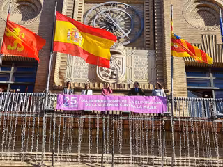 Colocación de la pancarta 25-N en el balcón principal del Ayuntamiento de Zaragoza - EUROPA PRESS