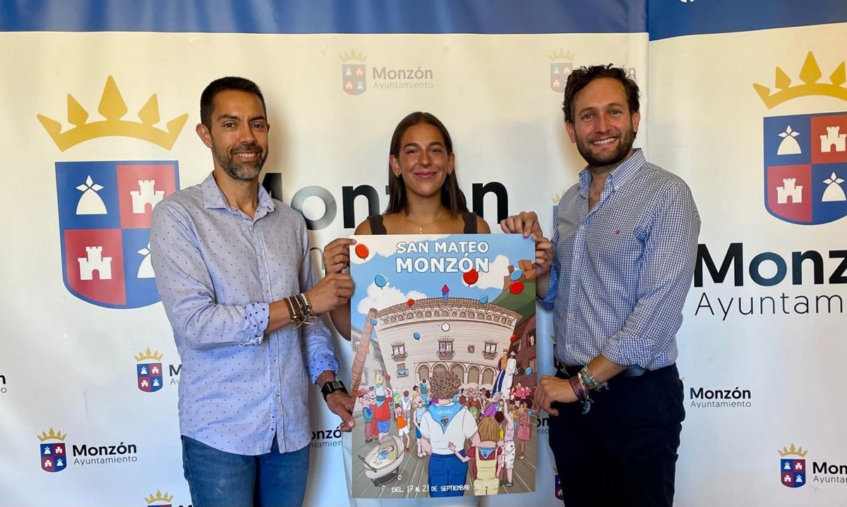 El alcalde de Monzón, Isaac Claver, y el concejal de Festejos, Jairo Sánchez, han recibido en el Ayuntamiento a Ainhoa Sopena Otero, autora de 'El Chupinazo', cartel ganador del concurso de carteles de las fiestas de San Mateo 2025, que fue elegido por la Comisión de Fiestas la semana pasada.