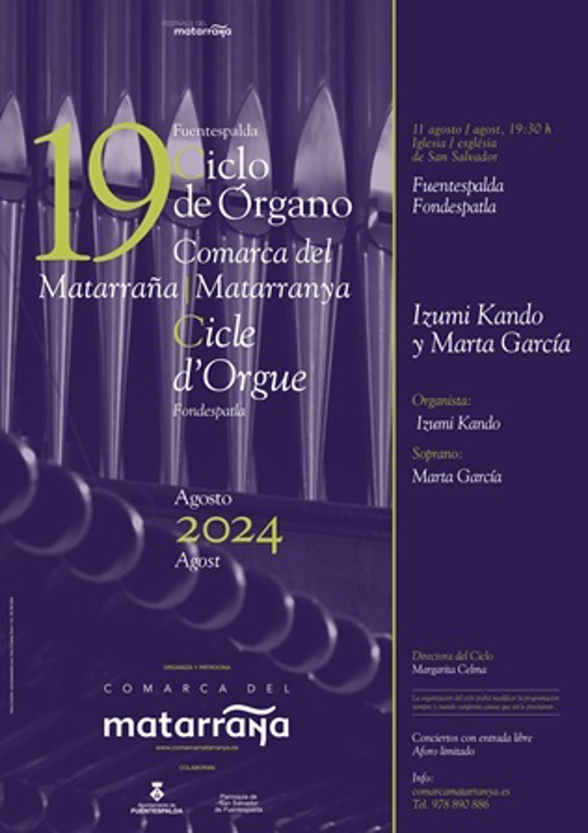 El Ciclo de Órgano que organiza el Departamento de Patrimonio de la Comarca del Matarraña, que este año cumple su XIX edición, regresa este domingo, 11 de agosto, a la localidad turolense de Fuentespalda, con un recital que tendrá lugar a las 19.30 horas en la iglesia de San Salvador.