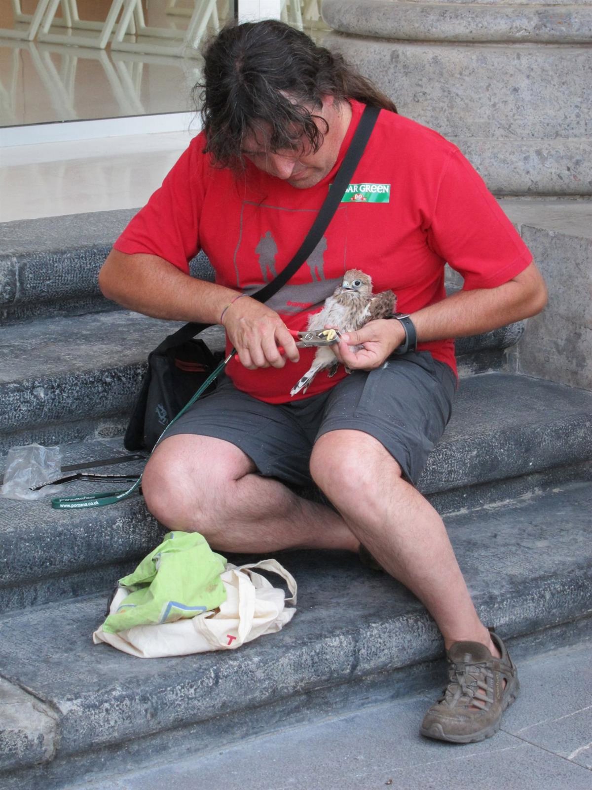 Una vez abajo, el ornitólogo responsable del anillamiento, Carlos Pérez, ha cogido uno por uno los cinco pollos, les ha colocado una anilla metálica identificativa a cada uno de ellos, además de tomarles medidas y pesarlos, antes de volverlos a dejar en sus nidos.