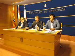 El diputado de la Diputación Provincial de Zaragoza (DPZ), Luis Bertol, el alcalde de Pinseque, Juan Luis Melús, y el técnico de la feria, Manuel Sanz, han presentado este jueves en rueda de prensa el evento, que se desarrollará los días 15, 16 y 17 de marzo en el Pabellón 'Ángel Calvo' del municipio.