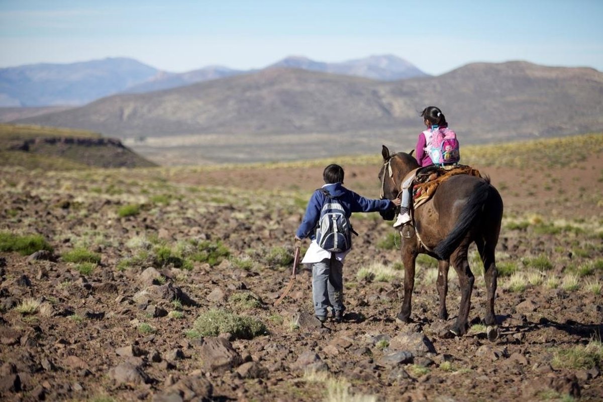 Por su parte, desde los 6 años Carlitos va a la escuela a caballo cada día, atravesando planicies y montañas de la Patagonia en un recorrido de 18 kilómetros que le lleva, con su hermana menor Micaela, desde su hogar en los Andes al colegio.