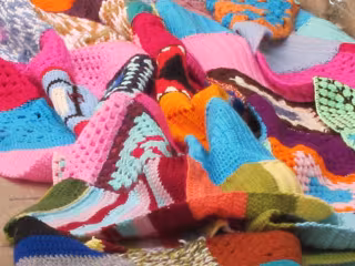 La asociación Urban Knitting Zaragoza ha tejido el tapiz que reproduce una portada del boletín del CIPAJ con la colaboración de lanas Stop, quien se ha encargado de aportar el material.