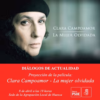 El PSOE Huesca continúa con su ciclo de encuentros abiertos a la ciudadanía sobre diversas temáticas y este lunes, 8 de abril, a las 19.00 horas, se proyectará la película 'Clara Campoamor. La mujer olvidada'.
