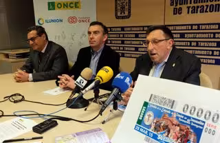 La Cofradía de la Entrada de Jesús en Jerusalén de Tarazona protagonizará el cupón de la ONCE de este sábado, día 28 de marzo. El alcalde de Tarazona, Luis María Beamonte; el delegado territorial de la ONCE, Ignacio Escanero, y el hermano mayor de la Cofradía, José Luis Lasheras, han presentado este jueves el décimo del que se repartirán cinco millones y medio por toda España.