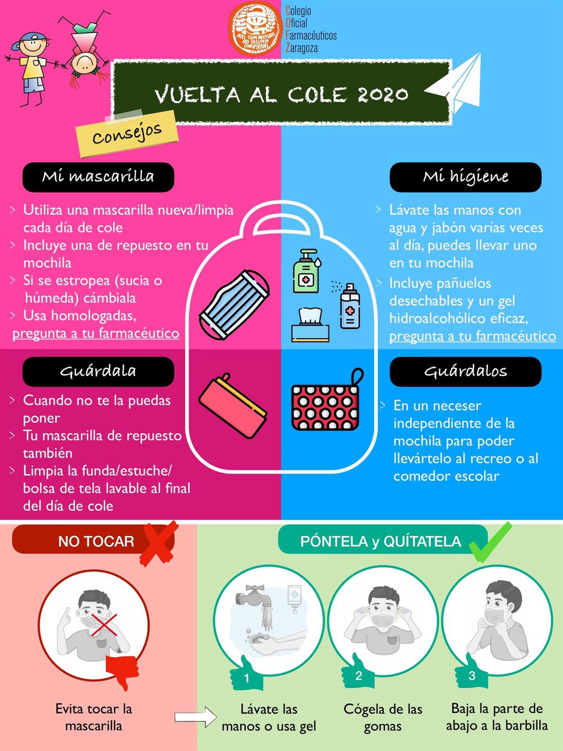 El Colegio de Farmacéuticos de Zaragoza (COFZ) ha elaborado una infografía para responder las dudas más habituales de los padres sobre las mascarillas, con motivo del inicio de curso 2020-2021. La vocal del Colegio, Pilar Labat, ha recordado la importancia de su uso: "Es una barrera de protección que impide que las gotas que producimos al hablar, y en las que viaja el virus, salgan fuera y puedan contagiar a otros".