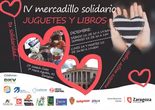 El Colegio Público Joaquín Costa de Zaragoza celebrará los próximos días 12, 13, 14 y 15 de diciembre la cuarta edición del Mercadillo Solidario de Juguetes y Libros, en su sede en el Paseo María Agustín de la capital aragonesa.
