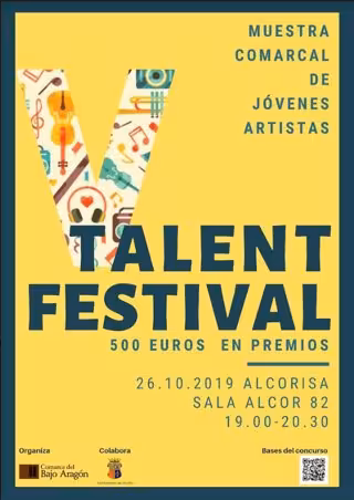 El área de juventud de la Comarca del Bajo Aragón ha organizado el V Talent Festival dentro de la V muestra comarcal de jóvenes artistas. Esta edición tendrá lugar en Alcorisa, el sábado 26 de octubre, en la Sala Alcor 82. En él pueden participar todos los jóvenes de 14 a 35 años vinculados al territorio del Bajo Aragón histórico.