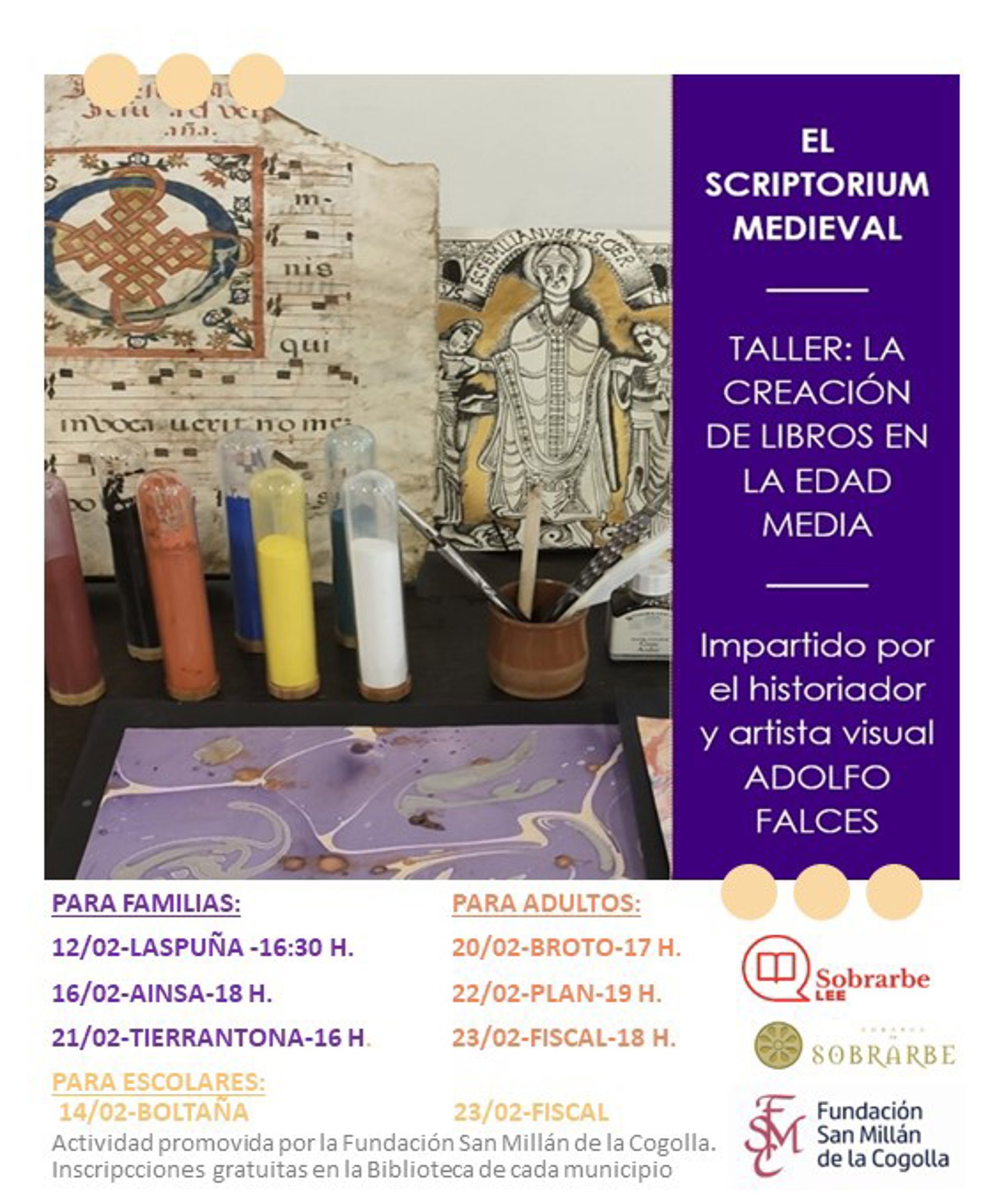 El servicio de Cultura de la Comarca de Sobrarbe, con el patrocinio de la Fundación San Millán de la Cogolla, ofrece nueve talleres sobre la creación de libros en la Edad Media, del 12 al 23 de febrero, dirigidos a familias, adultos y escolares, que se impartirán en las bibliotecas de siete localidades y en dos colegios.