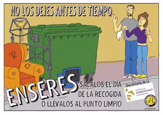 La campaña se plasma en un díptico en el que a través de una historia gráfica se especifica desde qué es un enser, es decir, qué se puede depositar y qué no junto a estos contenedores, los días de