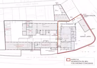Por el interior, el límite de la zona protegida discurre por el camino que bordea la nave de ajuste. El límite continúa por la fachada del taller nuevo, sin incluirla, y el muro que separa la finca de la colindante.