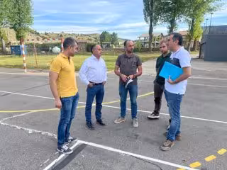 Samper visitaba la Colonia Polster con técnicos de la DPT y responsables de la empresa para cerrar los detalles la obra que comienza estos días y que permitirá contar con una pista polideportiva, con dimensiones oficiales para balonmano y baloncesto, en los exteriores del complejo.