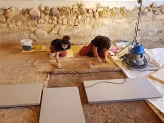 La intervención ha comenzado con la restauración del mosaico siguiendo lo establecido en el proyecto redactado en 2017 y consistirá en la limpieza y consolidación de la totalidad de los estratos musivarios, la corrección de las deformaciones y la reintegración de lagunas.