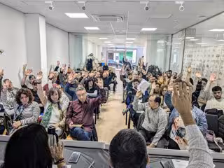 Momento de la votación a mano alzada del Comité Nazional de CHA este sábado en Zaragoza. - CHUNTA ARAGONESISTA