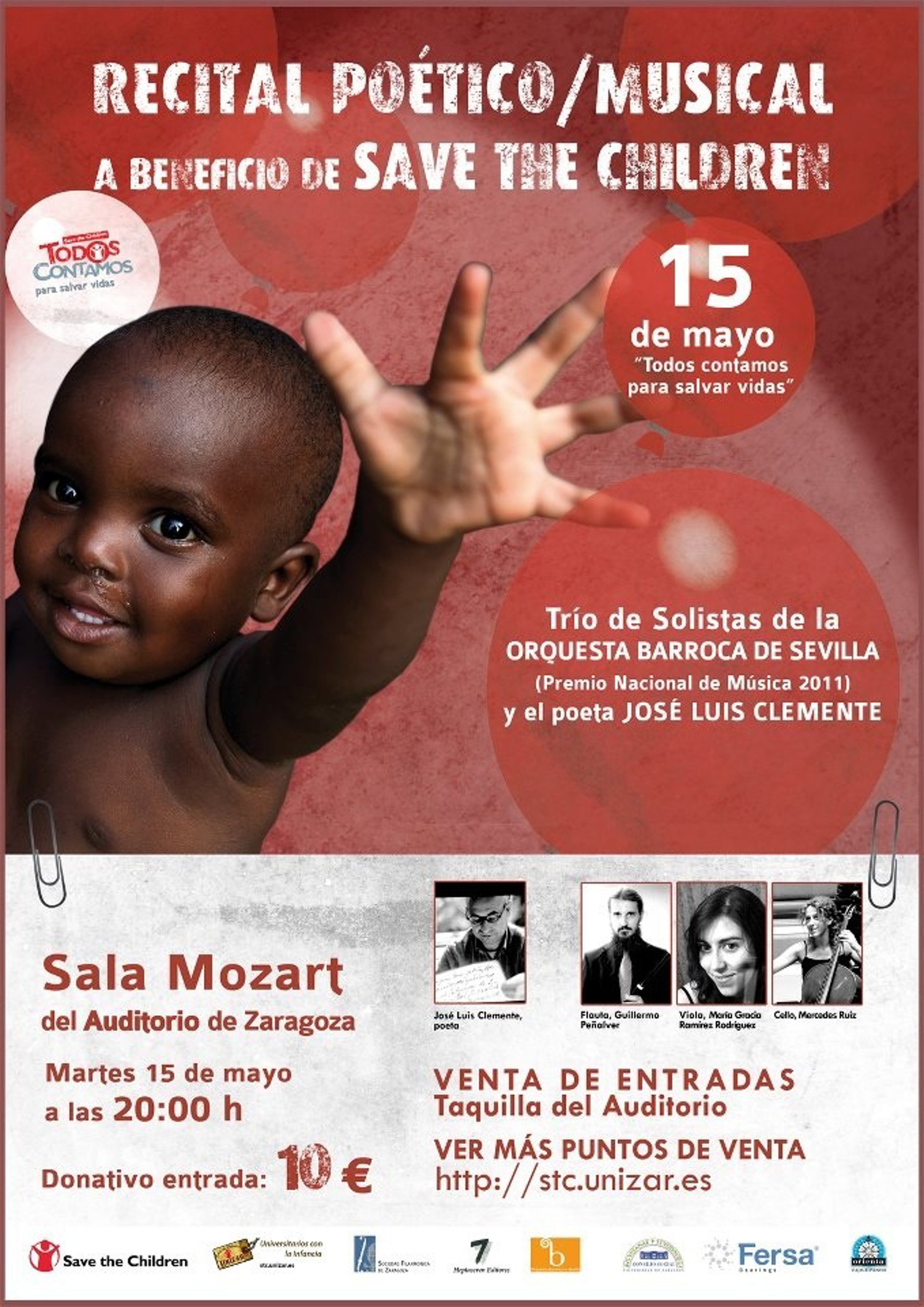Un recital poético-musical benéfico recaudará fondos para la campaña de la ONG 'Save the Children' denominada 'Todos contamos para salvar vidas'. Esta actuación tendrá lugar el martes 15 de mayo a las 20.00 horas, en la Sala Mozart del Auditorio de Zaragoza.