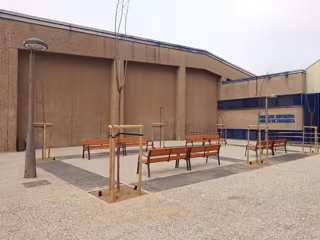 Así mismo se han creado franjas en el suelo que conectan los alcorques dotadas con pavimento filtrante para ayudar al desarrollo del arbolado y realizar un drenaje que evite las escorrentías que afectaban al centro deportivo y otros edificios cercanos.