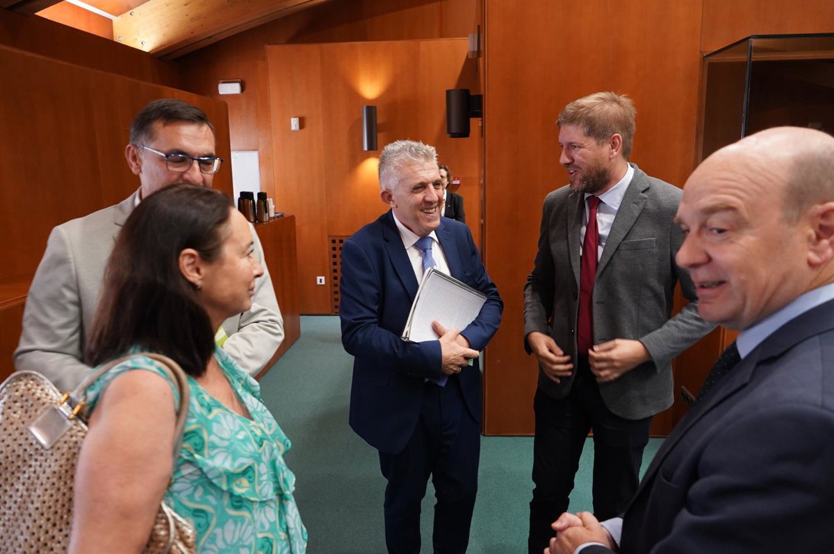 El consejero de Agricultura, Ganadería y Alimentación del Gobierno de Aragón, Ángel Samper, conversa con varios miembros de la Comisión del ramo de las Cortes autonómicas. - CORTES DE ARAGÓN.