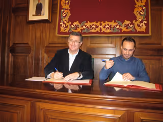 El alcalde de Teruel, Manuel Blasco y el presidente de la Asociación Cultural Banda de Música Santa Cecilia, Sebastián Guitarte, han firmado este viernes en el Ayuntamiento el convenio de colaboración para el presente año.