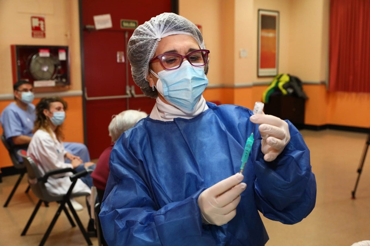 Una sanitaria ha inyectado la vacuna de Pfizer a Nájera a las 12.00 horas en una sala de la residencia, donde a continuación se han vacunado también otros dos residentes, Manuel Cebolla y Carmen García, así como dos trabajadores socio-sanitarios de la misma, María Sanz y Fernando Artal.