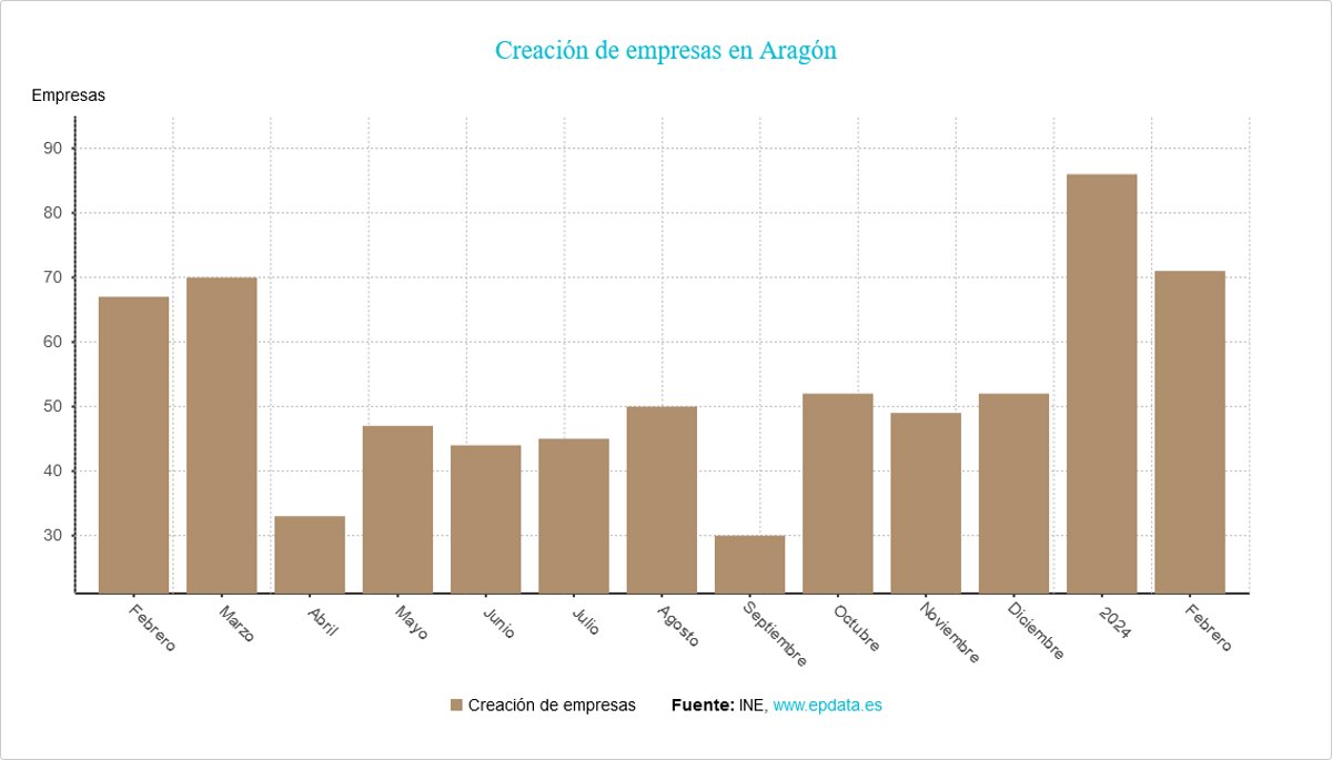 La creación de nuevas empresas en Aragón subió un 16,58% en febrero en tasa interanual con un total 218 sociedades mercantiles constituidas, en un mes en el que las empresas disueltas fueron 70, un 19,54% menos, según los datos difundidos este martes por el Instituto Nacional de Estadística (INE). Se trata del tercero mejor dato de constitución de empresas en un mes de febrero en la región de la serie histórica.