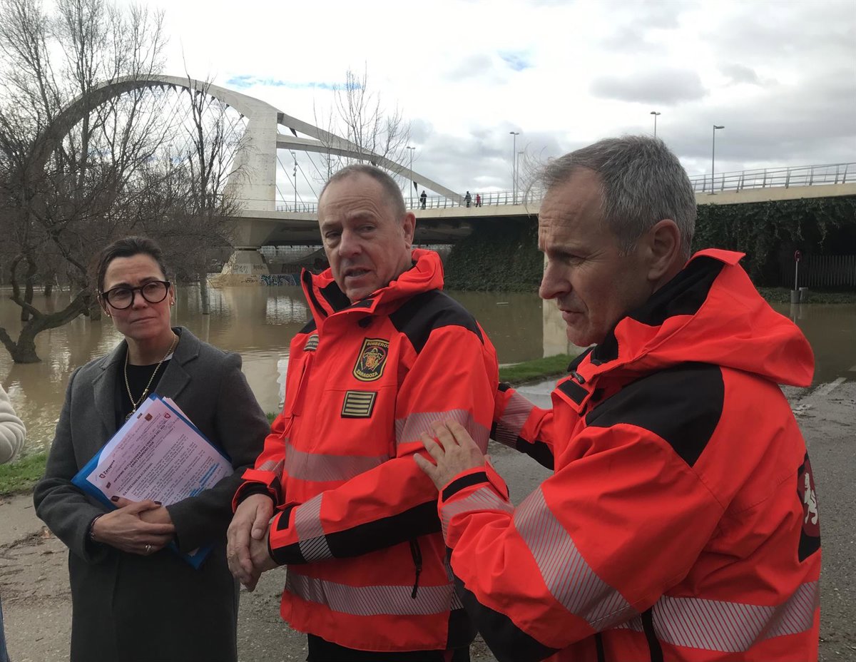 En el entorno del parking sur del Parque del Agua, uno de los puntos donde más visible es la crecida del río, Ruth Bravo se ha desplazado con el inspector jefe del Cuerpo de Bomberos de Zaragoza, Eduardo Sánchez, para supervisar el avance del Ebro.
