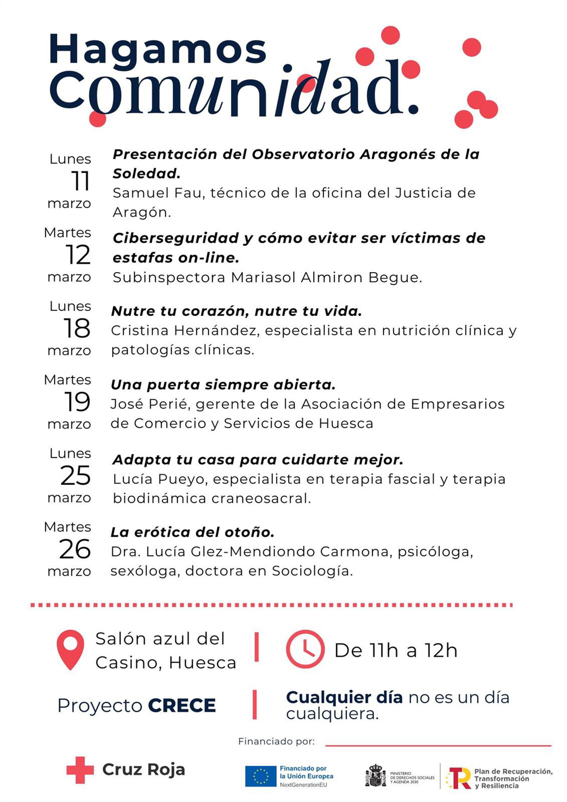 Cruz Roja en Huesca, a través del proyecto CRECE, pone en marcha este lunes, 11 de marzo, un ciclo de seis conferencias que tienen como enunciado común 'Haciendo comunidad contra la Soledad No Deseada'.