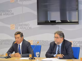 El consejero de Sanidad, Bienestar Social y Familia del Gobierno de Aragón, Ricardo Oliván, junto con el director gerente de Salud, Tomás Tenza, han presentado hoy los cuatro gerentes, en lugar de los ocho que ha habido hasta ahora, que se van a hacer cargo de las ocho áreas sanitarias de Aragón a partir del lunes.
