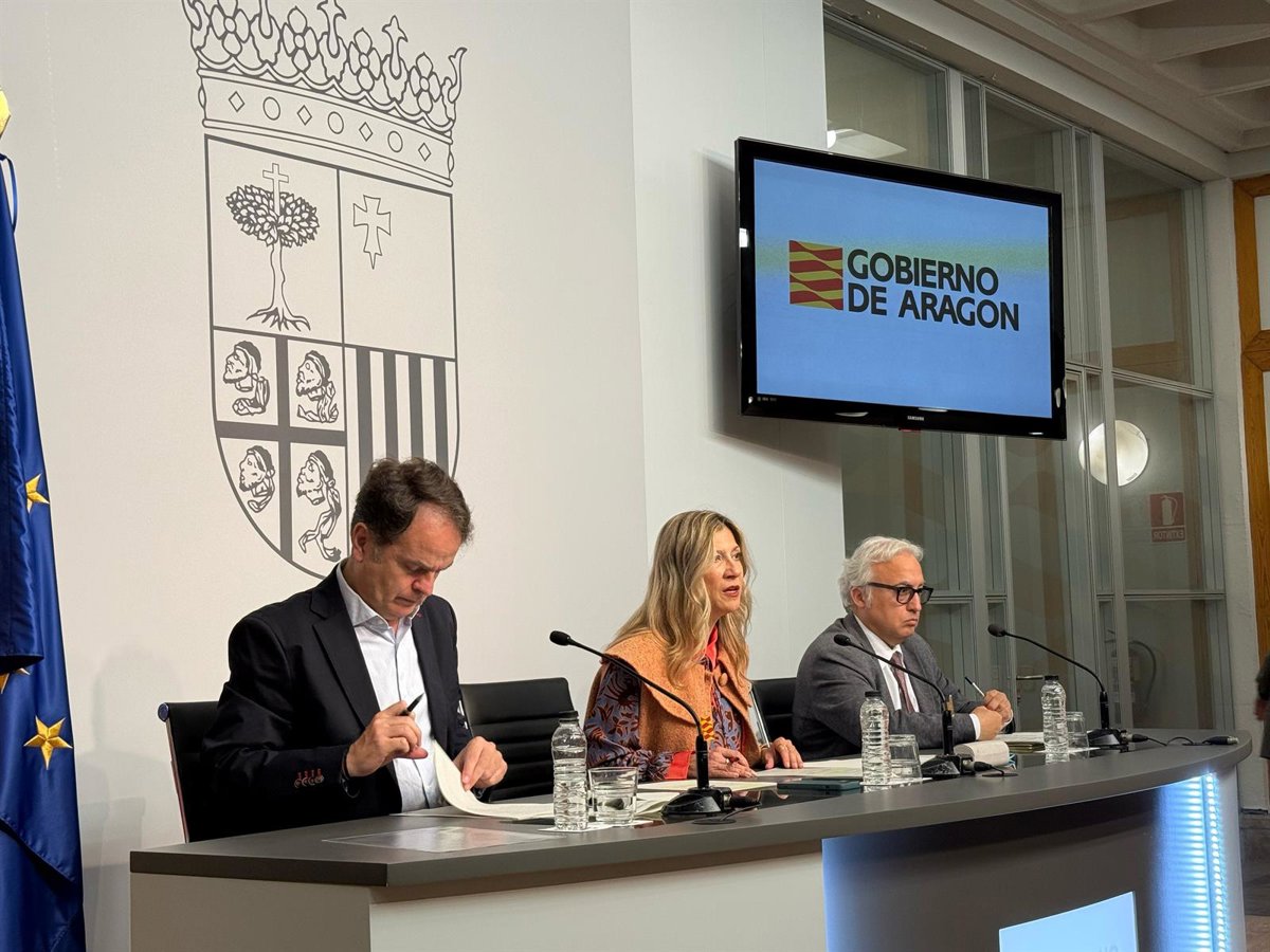 El consejero de Agricultura, Javier Rincón, junto con la vicepresidenta del Gobierno de Aragón, Mar Vaquero, y el consejero de Hacienda, Roberto Bermúdez de Castro, en la rueda de prensa posterior al Consejo de Gobierno. - DGA.