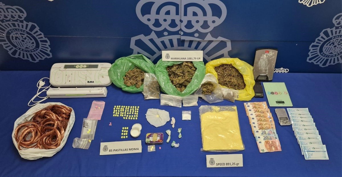 Los agentes aprehendieron de 847 gramos de speed, un kilogramo de marihuana 85 pastillas de extásis, 500 gramos de cafeína como sustancia de corte, así como otros útiles e instrumentos destinados a la fabricación, manipulación y venta directa de la droga.