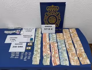 En la operación se intervienen un total de 240 gramos de hachís, distribuidas en dos pastillas de mayor peso y numerosas dosis ya preparadas para su venta directa al consumidor, 2 gramos de cocaína divididos en papelinas, 5.715 euros en efectivo y numerosos útiles para la manipulación y posterior distribución de las sustancias estupefacientes.