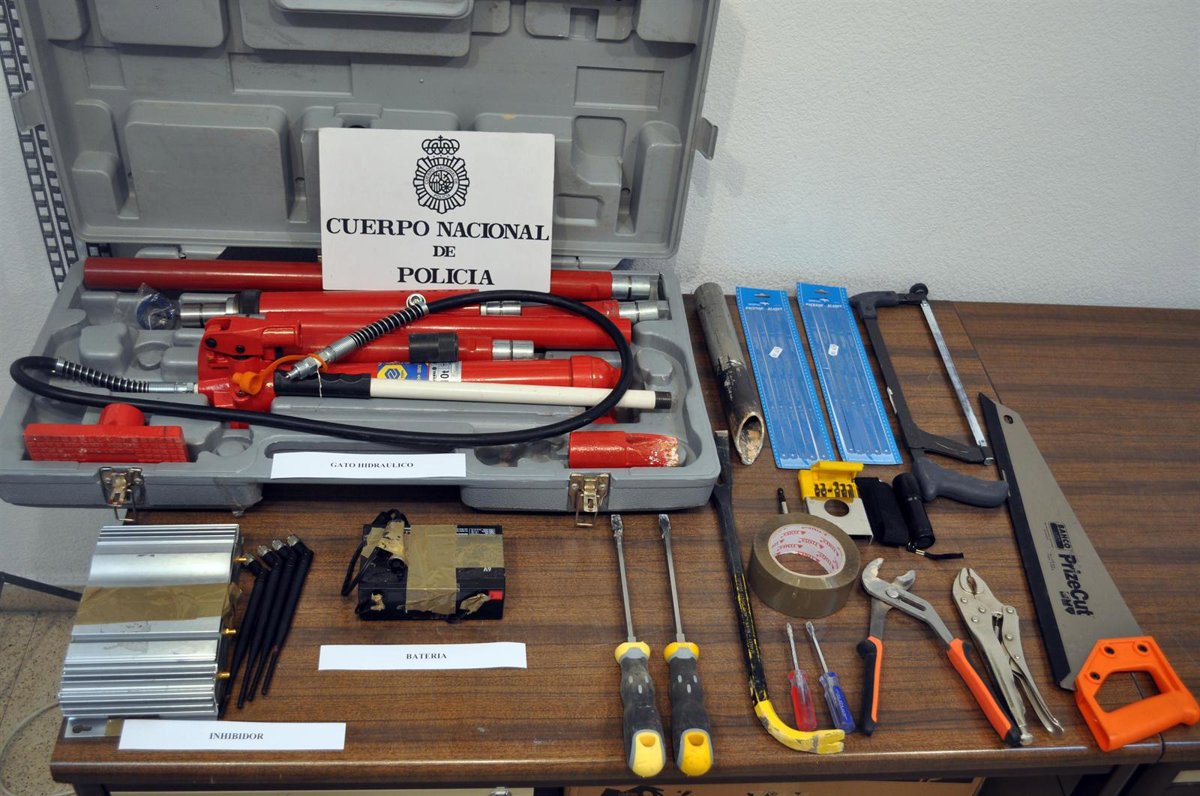En el interior del vehículo, que era una furgoneta y había sido alquilada en Madrid, se encontraron numerosas herramientas utilizadas para realizar el butrón, como llaves de grifería, una pata de cabra, un gato hidráulico de gran tamaño, varias sierras e igualmente se intervino un inhibidor de frecuencias para anular las alarmas de los establecimientos.