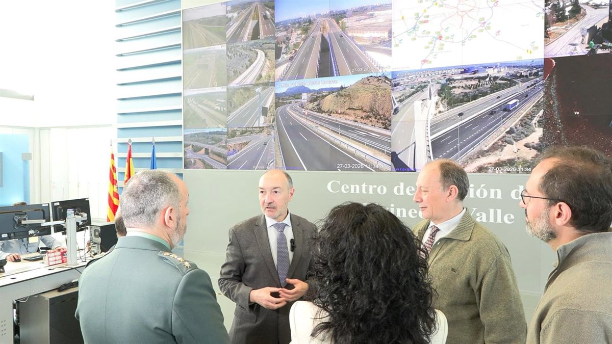 El delegado del Gobierno de Aragón, Fernando Beltrán, en el Centro de Gestión del Tráfico Pirineos-Valle del Ebro este viernes durante la rueda de prena para presentar la Operación Especial de Tráfico Semana Santa 2026. - EUROPA PRESS