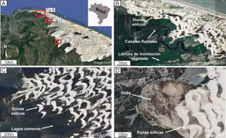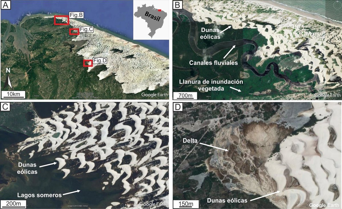 Imágenes de Google Earth del Parque Nacional de Lenois Marahensis (noreste de Brasil) donde se desarrollan dunas eólicas, canales fluviales, deltas, llanuras de inundación vegetadas y lagos someros. - CAMPOS-SOTO Y COLABORADORES (SEDIMENTOLOGY)