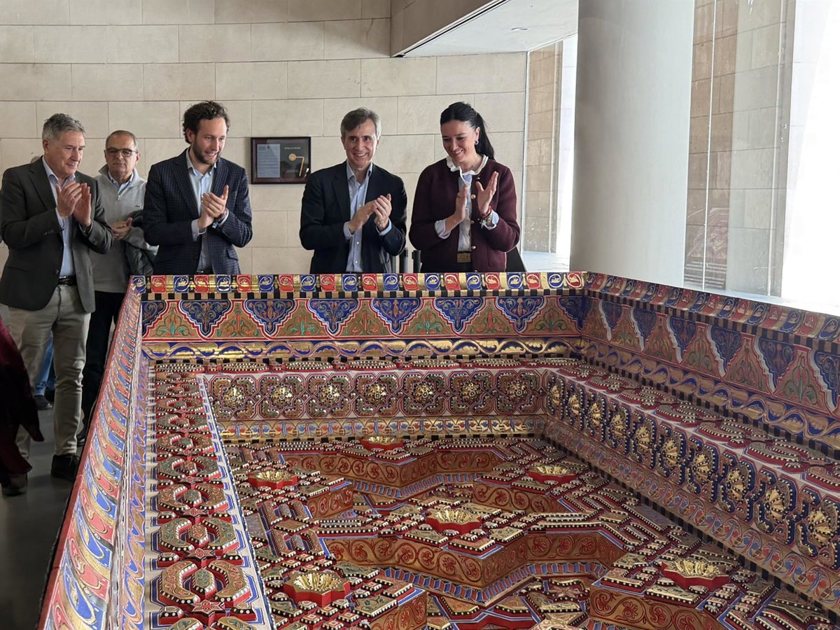 El hall de la Diputación Provincial de Huesca expone desde este lunes y hasta el 22 de marzo el cuarto alfarje de la Sala Capitular del Monasterio de Sijena reconstruido por la Asociación 'Sigena Mágica'.
