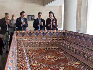 El cuarto alfarje recreado de la Sala Capitular del Monasterio de Sigena inicia una nueva etapa expositiva en la sede de la Diputación Provincial de Huesca, donde este lunes ha sido presentado oficialmente en un acto que ha contado con la presencia del presidente de la Diputación, Isaac Claver, la alcaldesa de Huesca, Lorena Orduna, y Juan Naya junto a todo el equipo del proyecto Sigena Mágica.