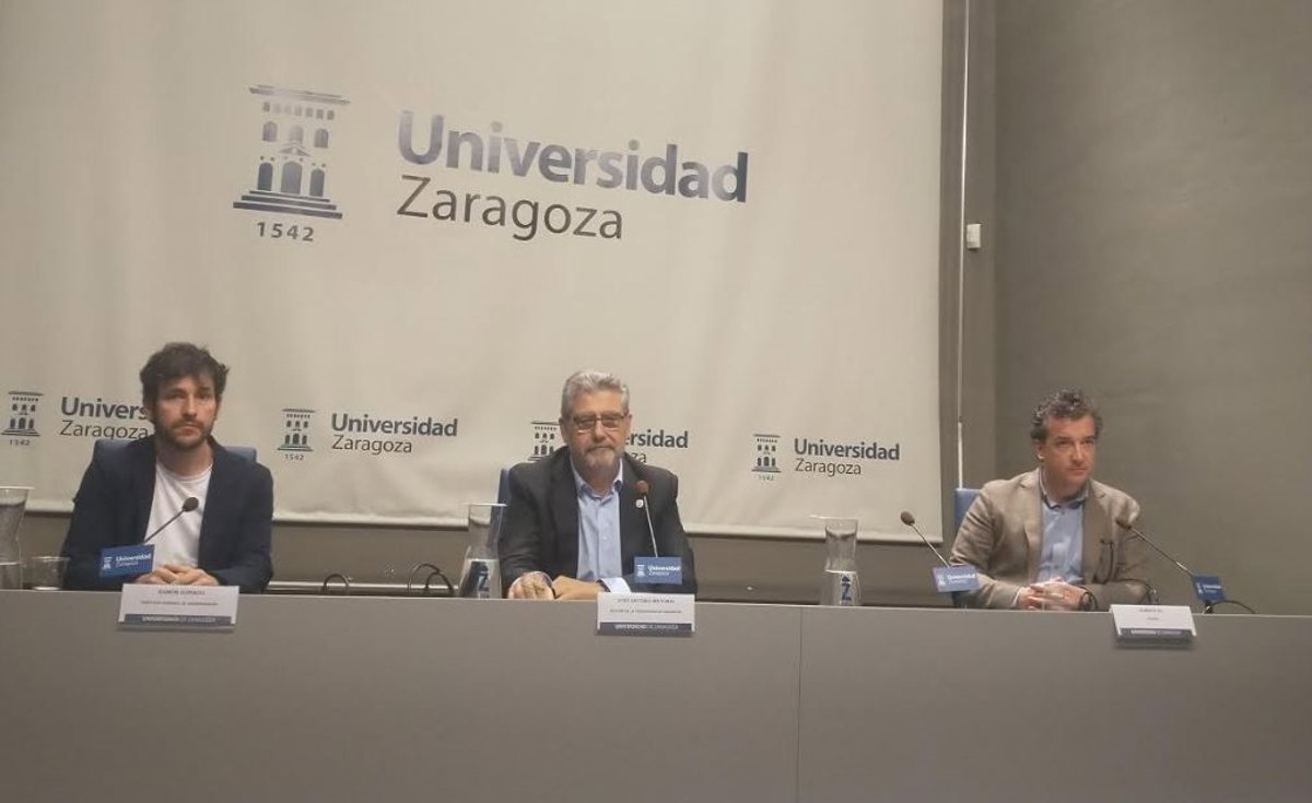 El rector en funciones, José Antonio Mayoral, el gerente de la universidad en funciones, Alberto Gil, y el director general de Universidades del Gobierno de Aragón, Ramón Guirado, este viernes en rueda de prensa en el Edificio Paraninfo. - EUROPA PRESS