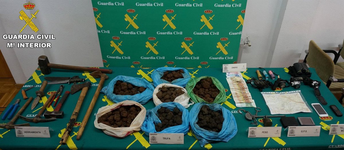 Las detenciones se produjeron el pasado viernes 22 de enero al interceptar el vehículo de los autores a la altura de la localidad de Borja (Zaragoza). En el momento de la detención portaban más de 9 kilos de trufa negra, de la que se está investigando su procedencia, y utensilios como cámaras nocturnas, linternas frontales, GPS y herramientas diversas entre ellas cizallas para cortar alambradas y otras utilizadas en la extracción de las trufas.