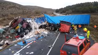El suceso ha ocurrido en torno a las 18.30 horas. Los bomberos de la Diputación de Zaragoza se encuentran en el lugar de los hechos, donde hasta ahora se han centrado en la búsqueda de uno de los conductores, que había quedado atrapado entre el amasijo de hierros y la carga de ambos vehículos.