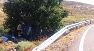 Dos personas han resultado heridas, en principio de carácter leve, en un accidente de tráfico ocurrido esta mañana en la carretera A-1506 dentro del término municipal zaragozano de Almonacid de la Cuba, al salirse de la vía su vehículo y volcar sobre un lateral, quedando finalmente el turismo debajo de un árbol.