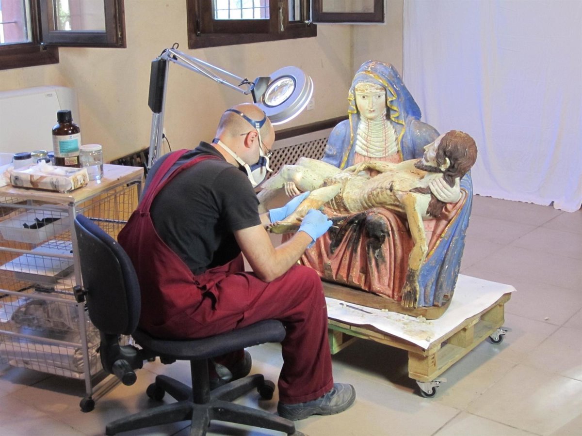 Realizado el estudio y diagnóstico previo, se está trabajando en la limpieza mecánica y química de los bienes, después de fijar sus policromías originales. Con posterioridad se procederá a la reintegración formal y cromática, atendiendo especialmente la fijación de los elementos sueltos de la Virgen de las Angustias.