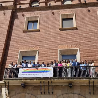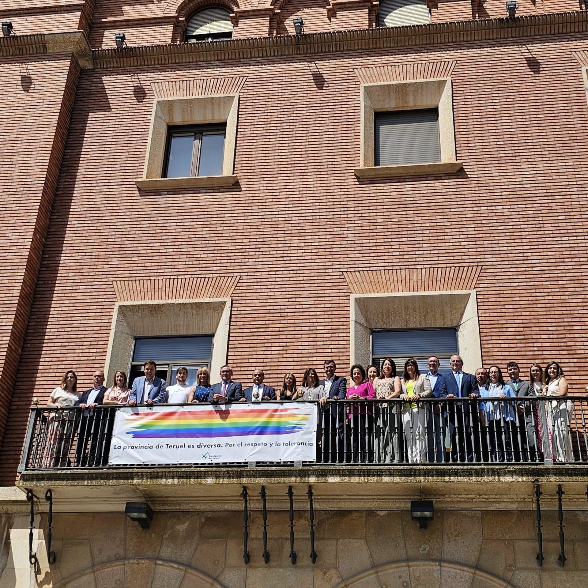 El presidente de la Diputacción Provincial de Teruel, Joaquín Juste, junto con otros miembros de la institución en el balcón del Palacio Provincial. - DPT.