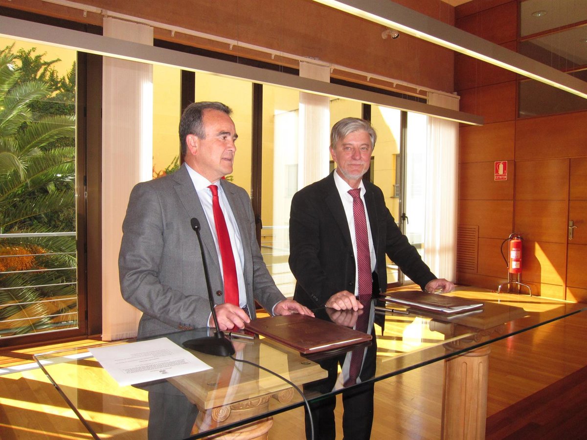 El alcalde de la capital aragonesa, Pedro Santisteve, y el presidente de la Diputación Provincial de Zaragoza (DPZ), Juan Antonio Sánchez Quero, han firmado este miércoles el convenio de cooperación para la realización de obras en infraestructuras y equipamientos de los barrios rurales del municipio de Zaragoza en el periodo 2017-2019, que está dotado con 9 millones de euros, distribuidos en tres anualidades iguales.