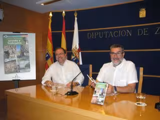 El diputado delegado de Turismo de la DPZ, Bizén Fuster, y uno de los autores de la nueva publicación, Santiago Cabello, han presentado en rueda de prensa esta guía 'Castillos y Palacios del Aranda y Valdejalón', de la que se han editado 5.000 ejemplares que se encontrarán, de forma gratuita, en oficinas de turismo y en los ayuntamientos de estas localidades, así como puede descargarse desde el área de Turismo de la página web de la institución provincial, en la dirección 'http://zaragozaturismo.dpz.es/'.