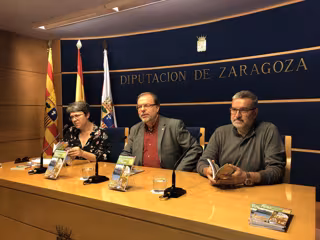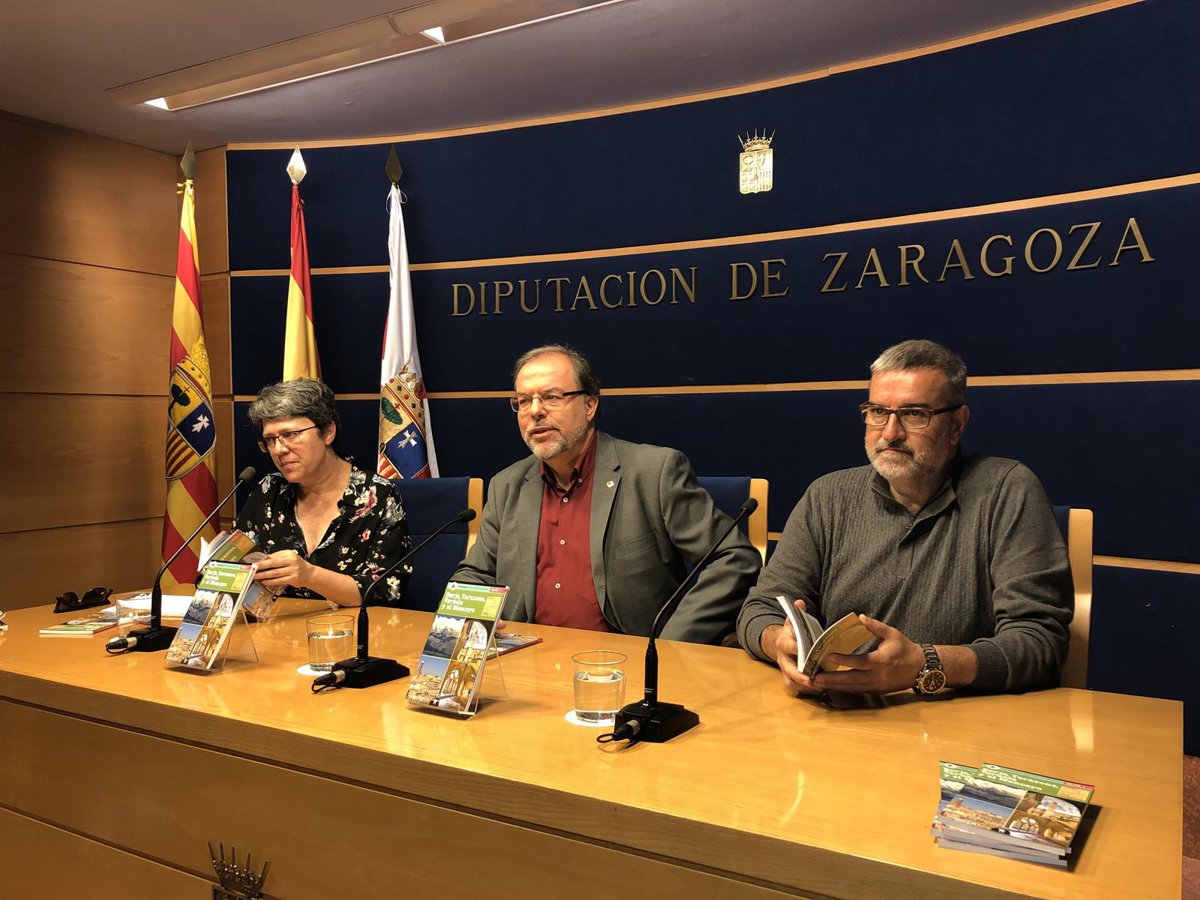 El diputado delegado de Turismo de la DPZ, Bizén Fuster, y los autores de la guía, Santiago Cabello y Marisancho Menjón, han presentado en rueda de prensa este lunes esta guía turística que recorre la última de las once rutas diseñadas por la institución y que se han promocionado en estos cuatro años junto a un mapa que recoge todos los recorridos y del que se han distribuido más de 90.000 ejemplares.